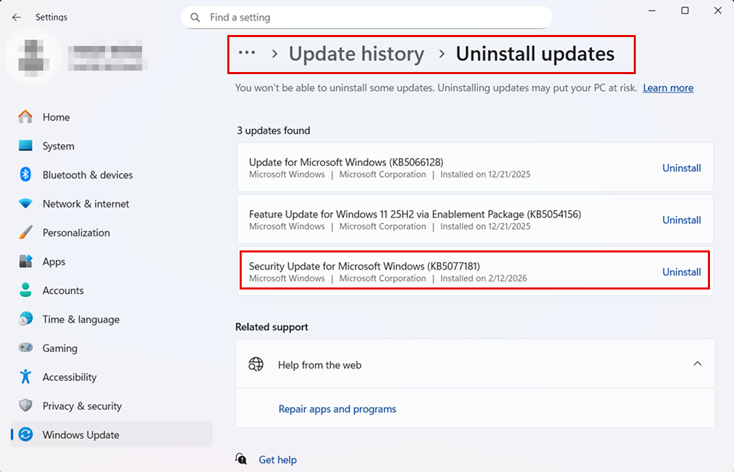 Choose Security Update for Microsoft Windows(KB5077181) and click Uninstall.