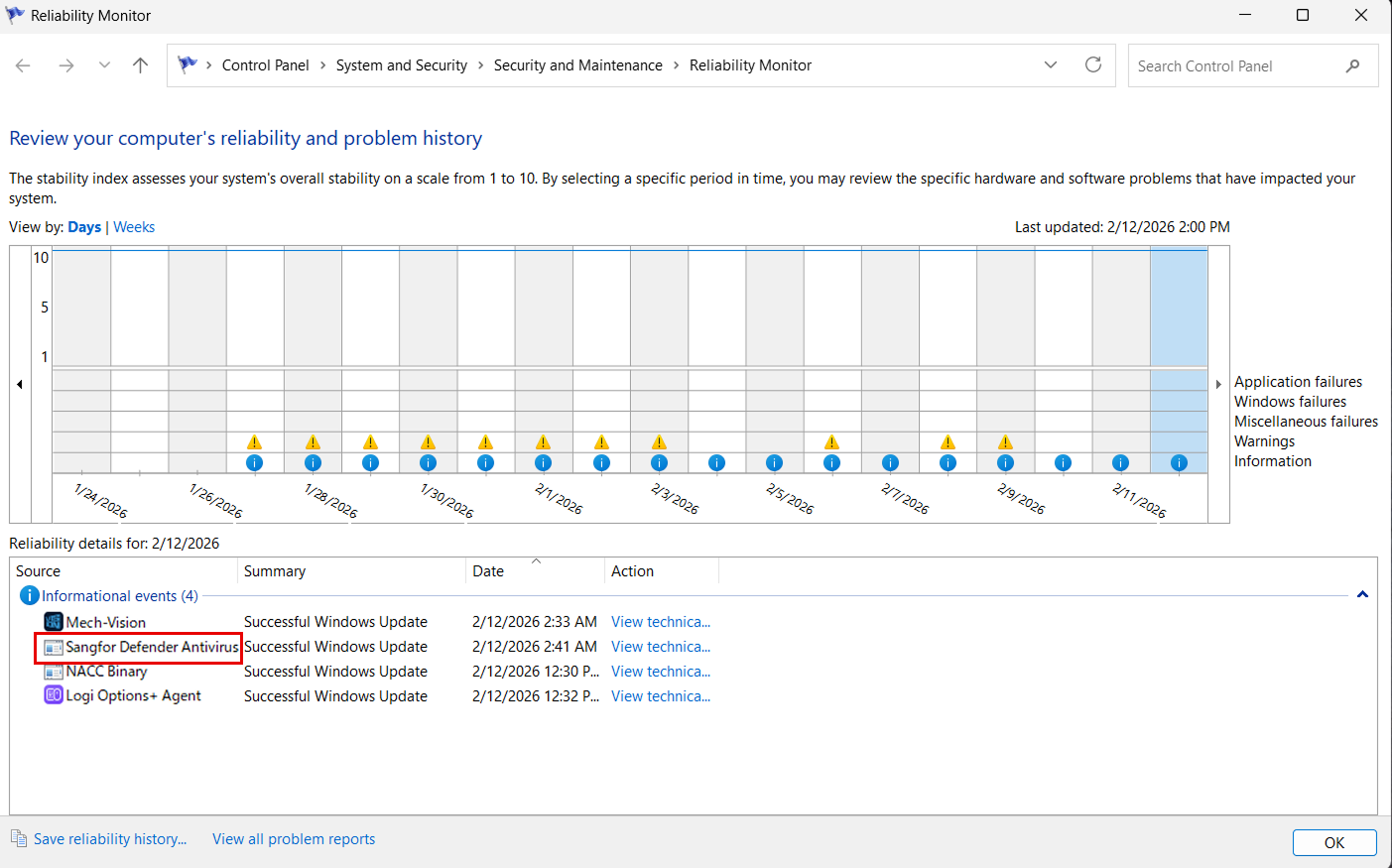In the Reliability Monitor, you may find records related to programs such as Sangfor Defender Antivirus Service and Microsoft Defender Antivirus, as shown in the figure below.
