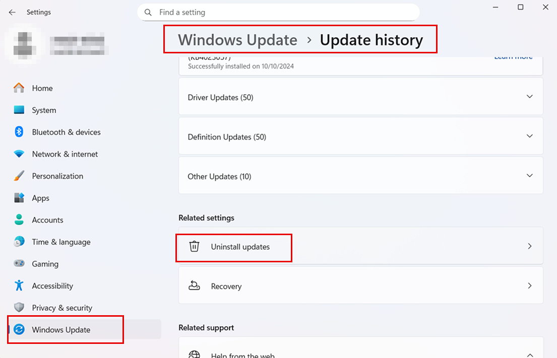 Open the Settings window on your computer, go to Windows Update, and click Update history.