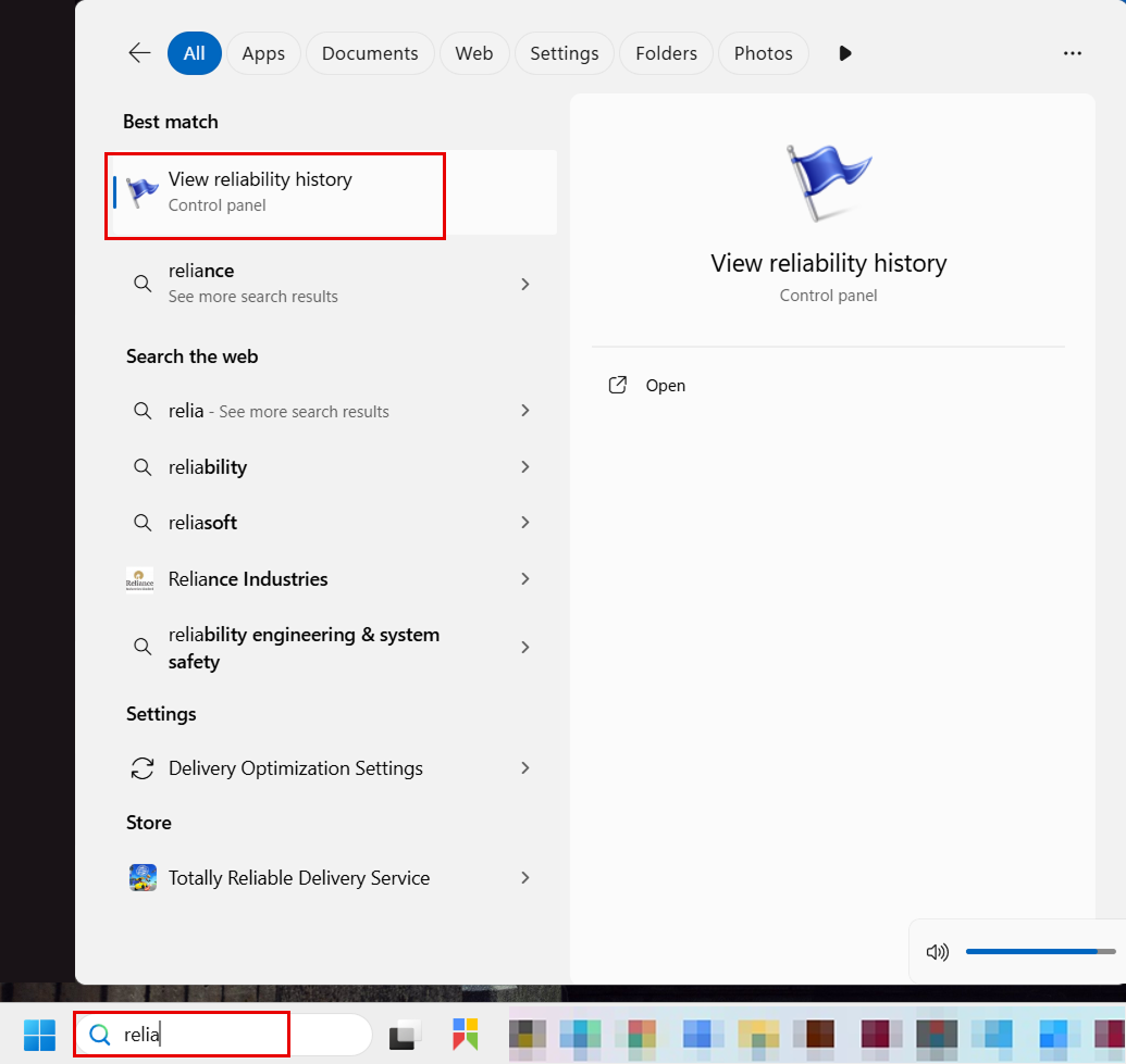 In the Start menu search box, type reliab, then click View reliability history, as shown in the figure.